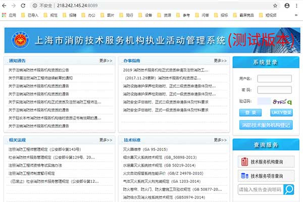 为深入贯彻《关于深化消防执法改革的意见》和《消防技术服务机构从业条件》,上海市消防技术服务机构执业活动管理系统已进行改版升级,请各机构即日起登录测试系统(登录地址:http://218.242.145.24:8089)开展系统测试,现将有关要求明确如下: